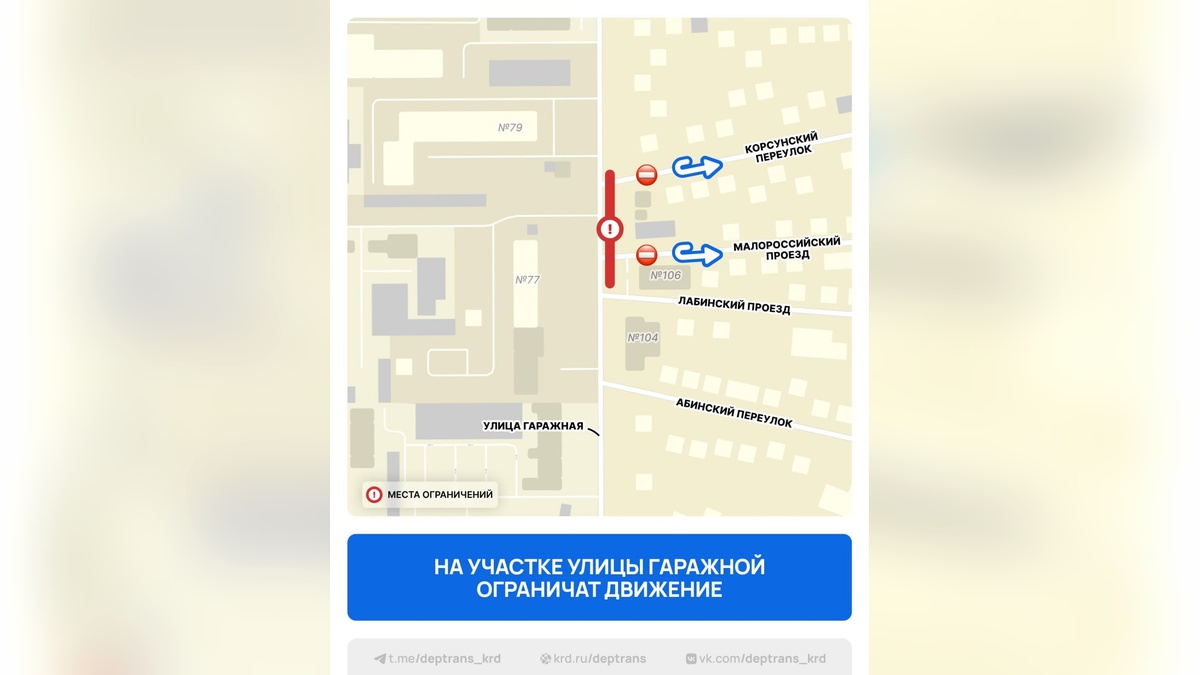 Уточняется, что на время работ перекроют для проезда лишь одну полосу на данном участке по направлению из центра города. Также временно станет невозможен поворот с Гаражной на Корсунский переулок и Малороссийский проезд — они временно превратятся в тупики.