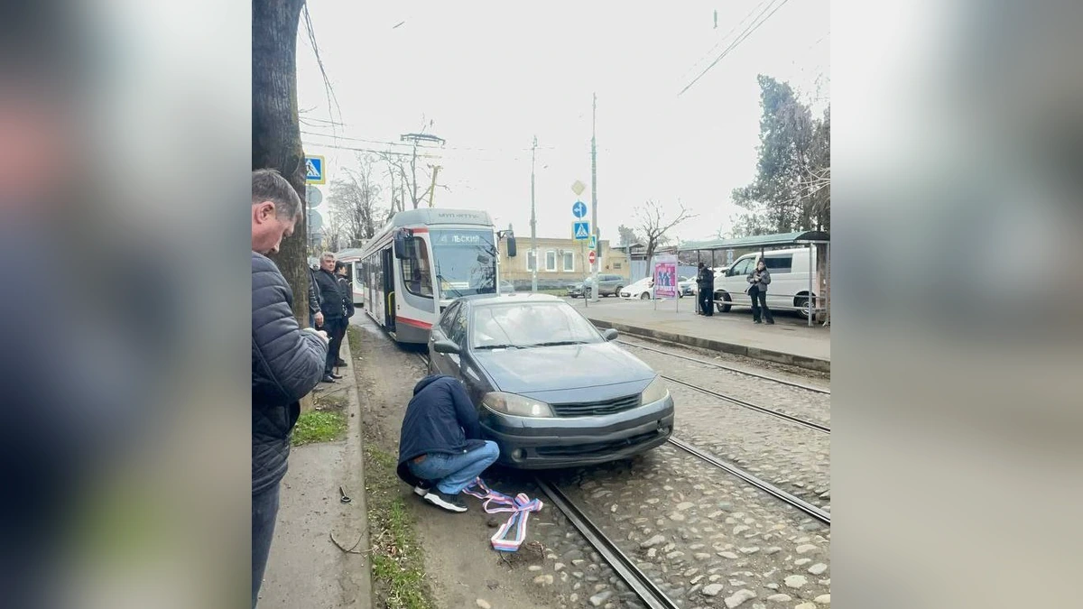 На фото и видео, выложенных в соцсети очевидцами, видна застрявшая на рельсах иномарка и несколько остановившихся трамваев.
