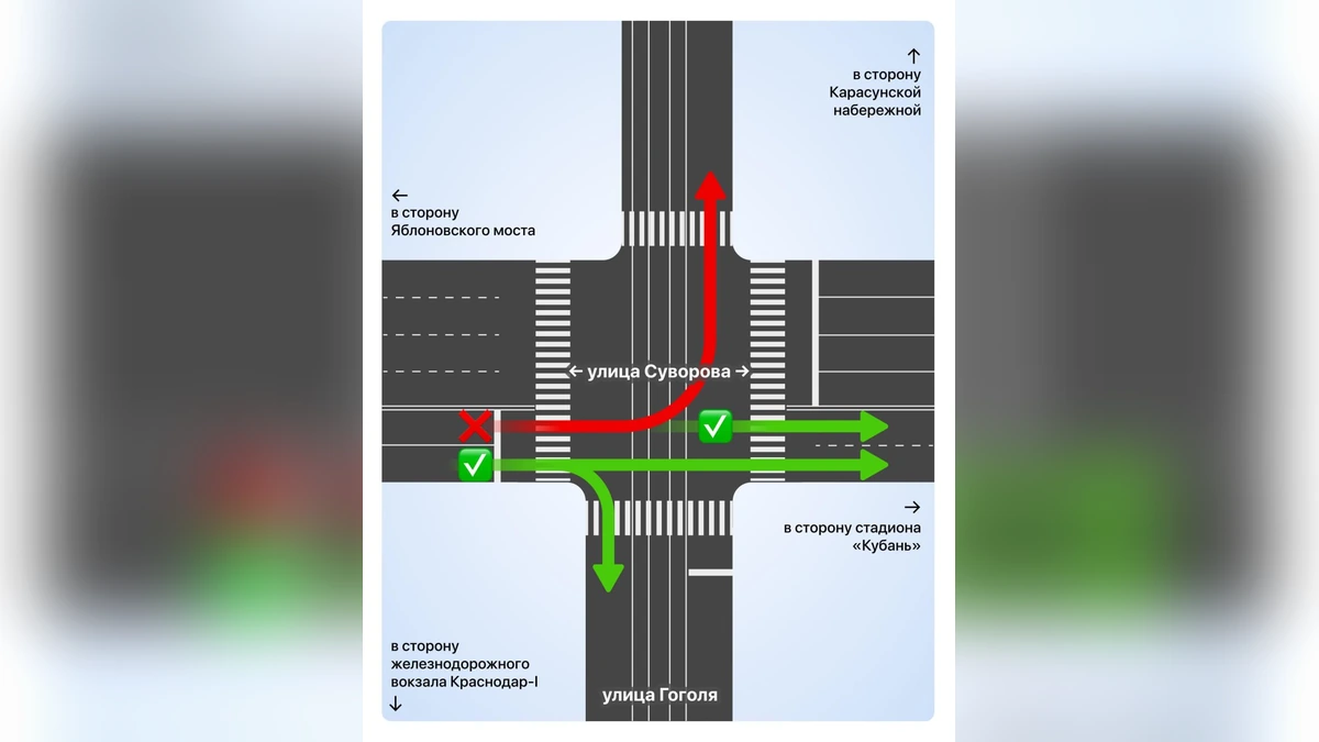 Изменения решили ввести из-за высокой аварийности на этом участке. Будет запрещен левый поворот с улицы Суворова на улицу Гоголя при движении в сторону стадиона «Кубань». На этом перекрестке сохранится правый поворот к железнодорожному вокзалу «Краснодар-I».