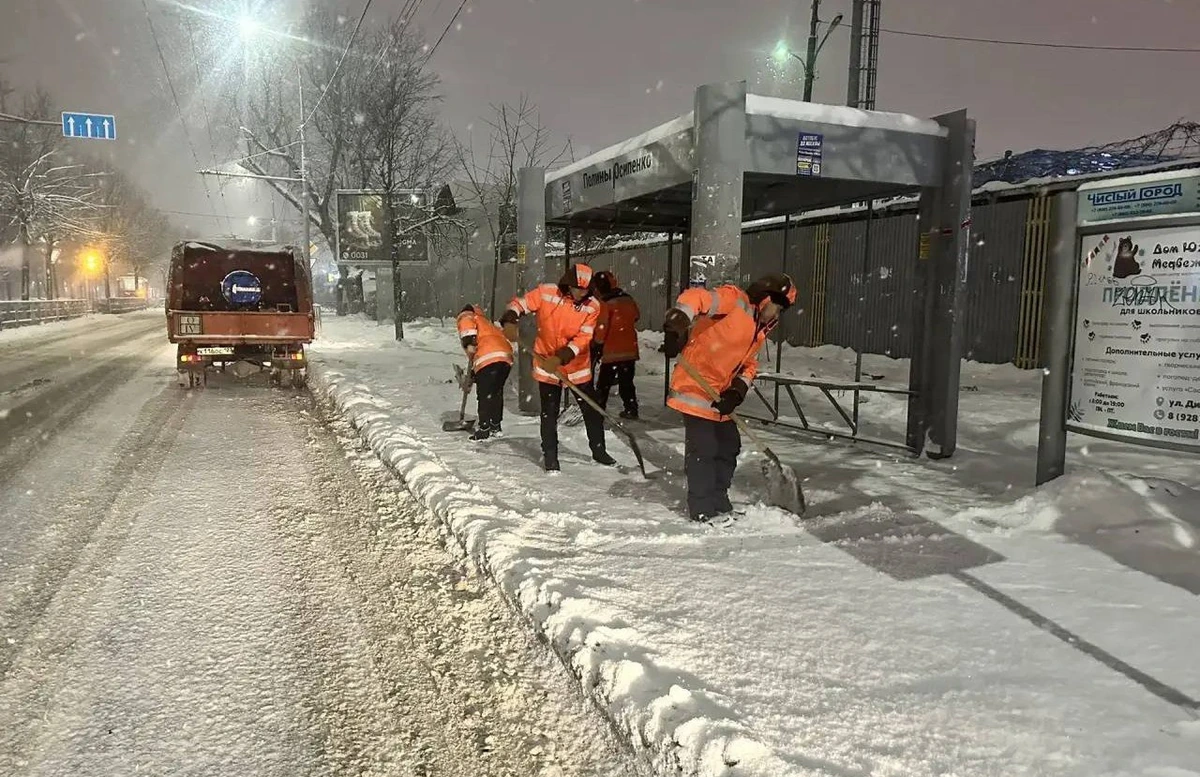 Работа по расчистке снега продолжается в городе в круглосуточном режиме, сообщили в пресс-службе администрации Краснодара.