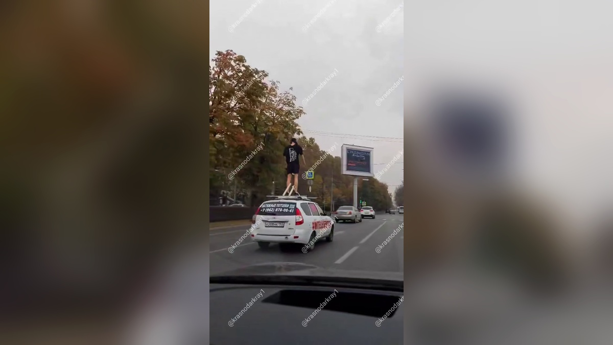 На кадрах видно, как по центру города едет легковушка, на крыше которой с помощью деревянных досок вертикально закреплен мужской манекен в одежде.