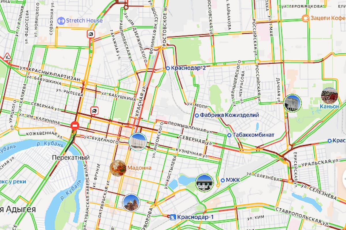 На улице Калинина «бордовая» пробка растянулась от улицы Костылева до улицы Братьев Игнатовых. А также в обратную сторону от улицы Энгельса до Котовского. Большой поток машин собрался на Северном мосту от Ялтинской до Школьной и на улице Новороссийской на подъезде к Северному мосту.