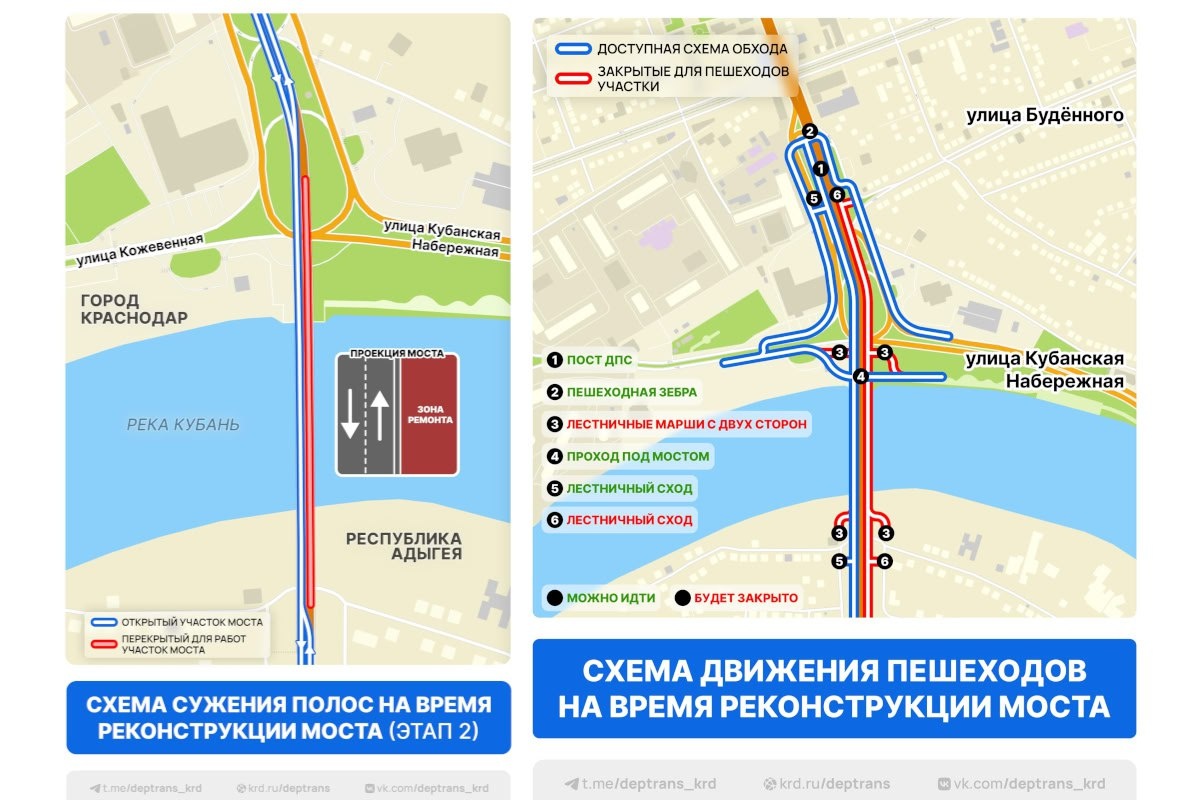 Пешеходы не смогут подняться через лестничные марши на обеих берегах реки Кубани. Подъемы по отремонтированной половине моста ориентировочно откроют с 1 декабря. Также не получится пройти по двум лестничным сходам, обозначенным №6 на схеме дептранса Краснодара.