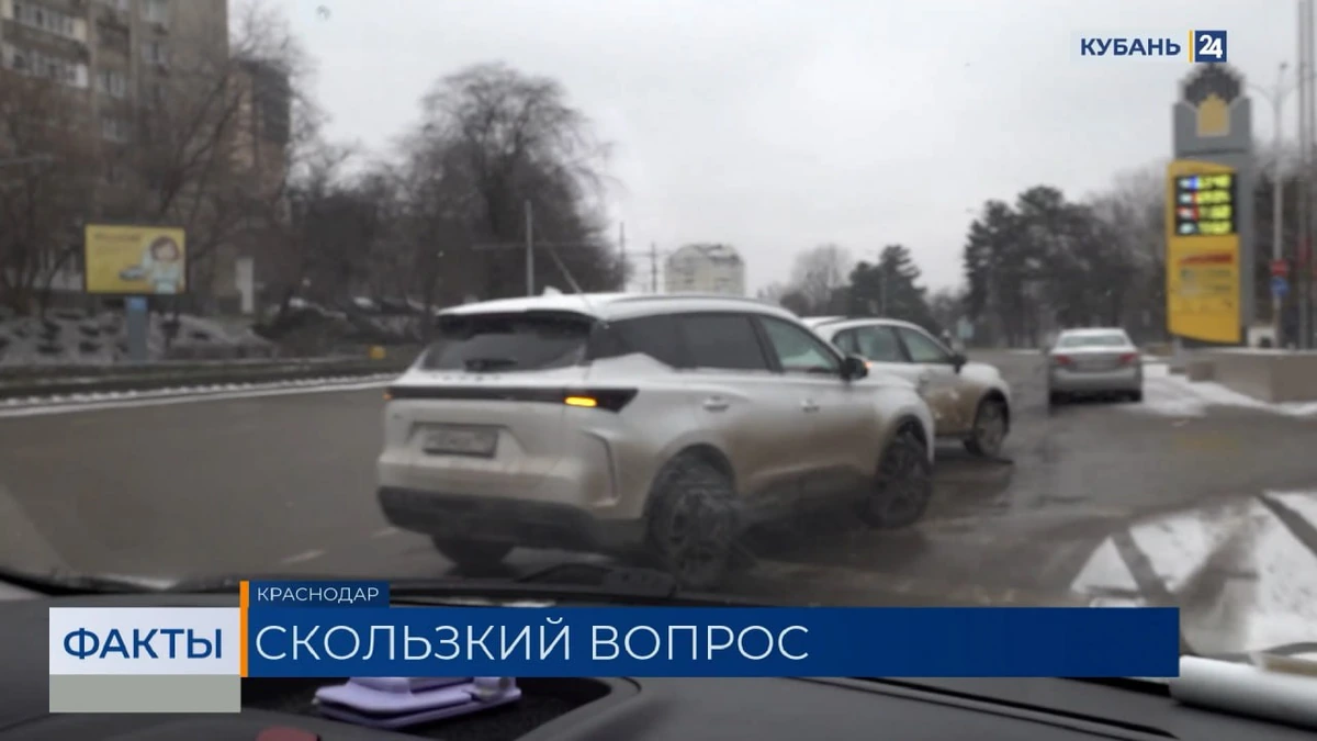 «Из-за гололеда увеличивается и количество аварий. Только за пару часов мы увидели три ДТП. Основные причины: резкое торможение, несоблюдение достаточной дистанции, невнимательность на дороге», — сообщает корреспондент телеканала «Кубань 24» Дарья Остапец.