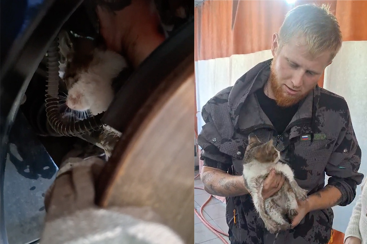 На помощь котенку выехала служба спасения. Спасатели обнаружили котенка за колесом. Нелегального пассажира удалось вызволить из плена не с первого раза.