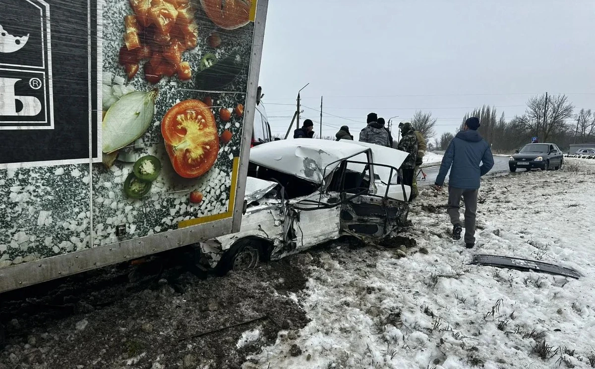 На фотографии с места происшествия видно, что легковой автомобиль, оказавшийся под грузовым фургоном, буквально смят.