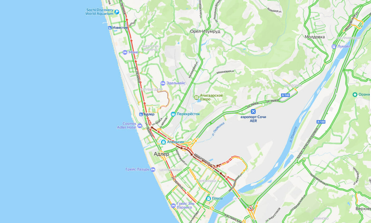 Жители и гости города сообщают об огромной пробке от аэропорта Сочи до адлерского ж/д вокзала. Согласно сервису «Яндекс Карты» пробка достигает 6 км.