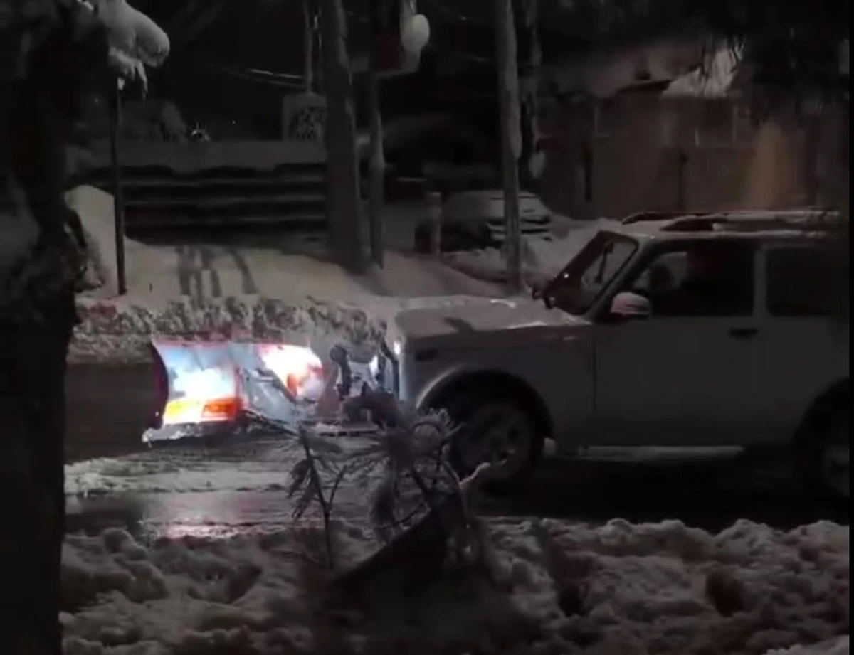 На кадрах белая «Нива» с помощью небольшого оранжевого отвала — ковша, прикрепленного спереди транспортного средства, для уборки снега на дорогах — расчищает одну из улиц поселка Красная Поляна. Машина выезжает на дорогу, разворачивается, опускает ковш и убирает им лежащий на проезжей части снег.