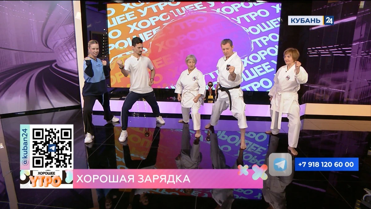 В студии утреннего шоу чемпионы России провели зарядку-разминку для каратистов, рассказали о том, как 75-летняя Зоя Гущина и 71-летняя Валентина Тамбовцева решили начать заниматься карате. Участницы проекта «Боевые бабушки» ответили на вопрос, ходят ли они в поликлинику, и дали советы зрителям программы.