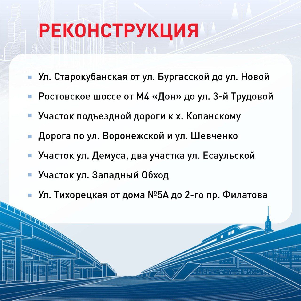Как писал интернет-портал «Кубань 24», план развития дорожной сети Краснодара включает строительство и реконструкцию 27 объектов общей протяженностью более 77 км.
