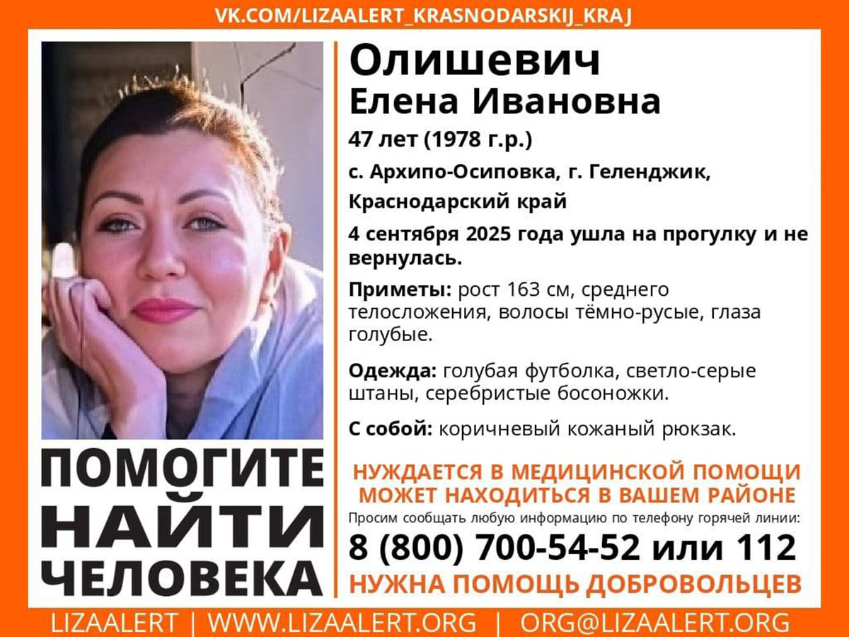 По словам родственников 47-летней женщины, ее местоположение установить не удалось. Елена Олишевич перед выходом оставила телефон дома и не сообщила никому из родственников о своих планах, взяв с собой только документы.