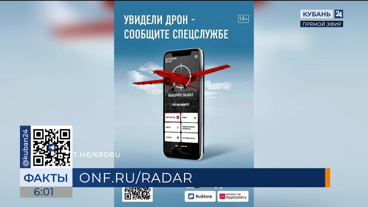 Как писал интернет-портал «Кубань 24», ОНФ запустил приложение, в котором можно в два клика сообщить о беспилотниках. В мобильном приложении «Радар.НФ» можно быстро сообщить о подозрительных беспилотниках или других чрезвычайных ситуациях, связанных с террористической угрозой.