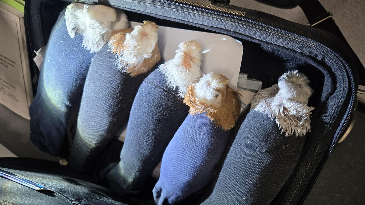 Голуби находились среди личных вещей водителя. Чтобы транспортировать их, иностранный гражданин поместил каждую птицу в носок. Обездвиженные голуби плотно лежали в небольшом чемодане.